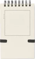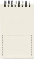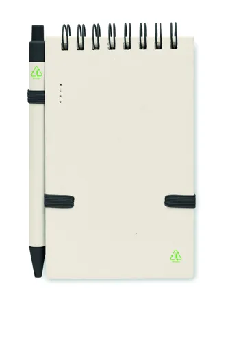 A6 spirálozott jegyzetfüzet. 70 sima lap, 70% újrahasznosított tejesdobozból és 30% újrahasznosított papírból. Hozzáillő nyomógombos golyóstoll, kéken író betéttel. Elasztikus zárópánt és tolltartó hurok.