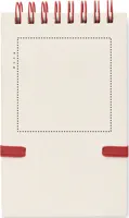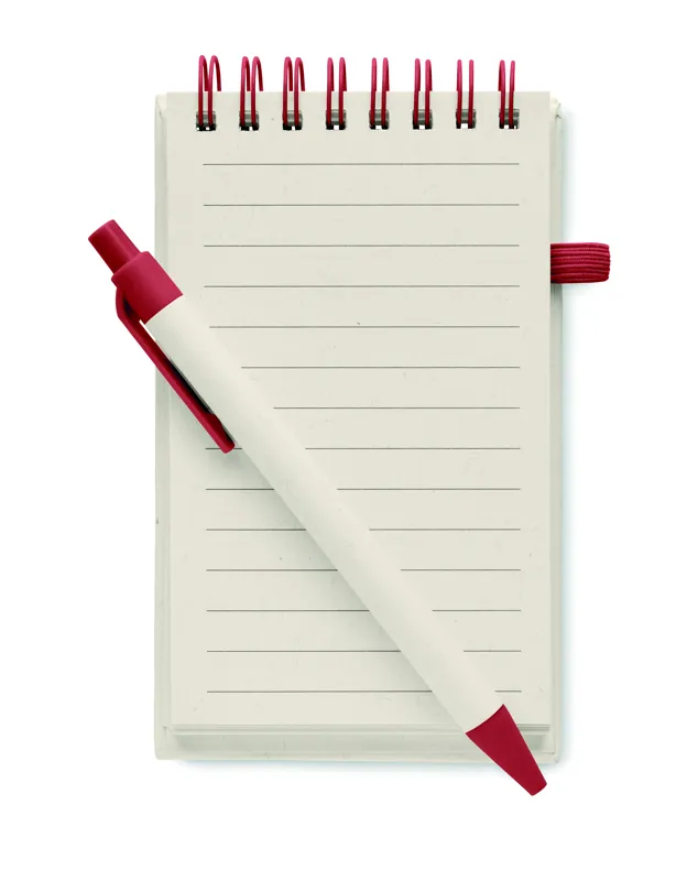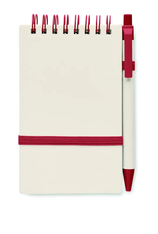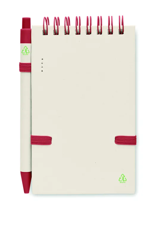 A6 spirálozott jegyzetfüzet. 70 sima lap, 70% újrahasznosított tejesdobozból és 30% újrahasznosított papírból. Hozzáillő nyomógombos golyóstoll, kéken író betéttel. Elasztikus zárópánt és tolltartó hurok.
