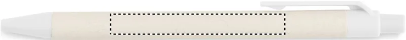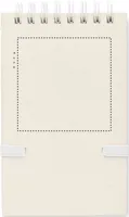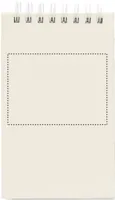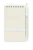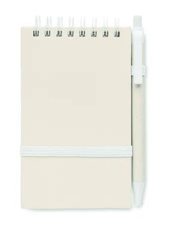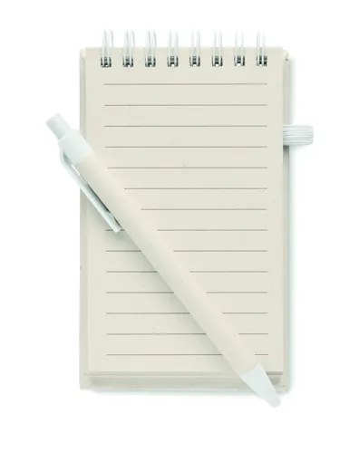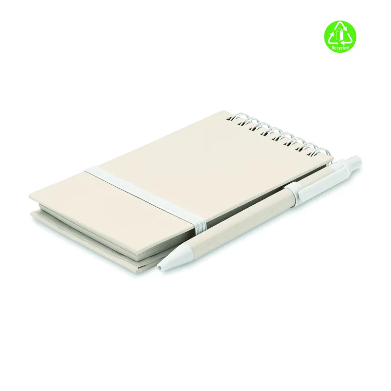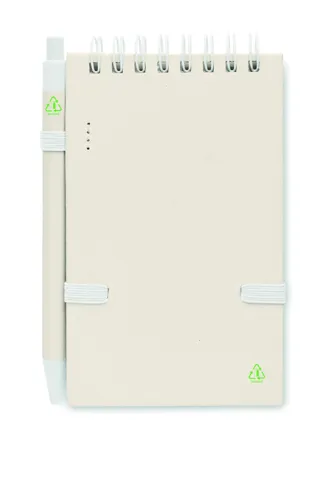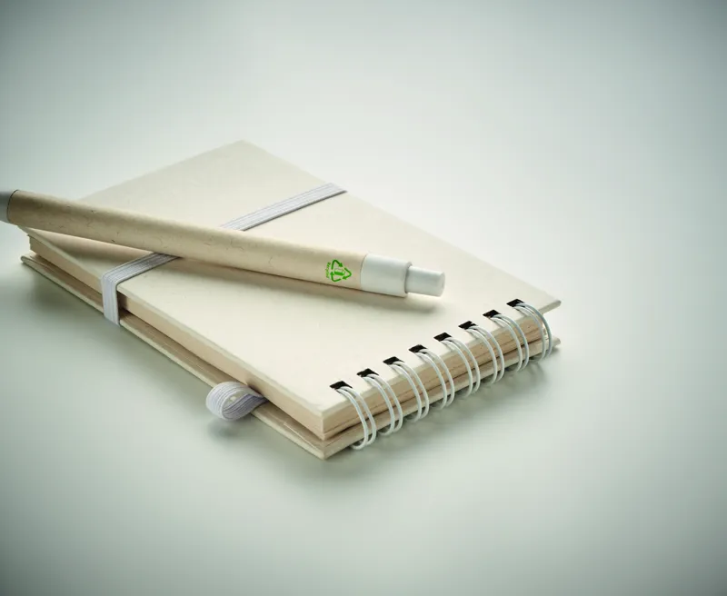 A6 spirálozott jegyzetfüzet. 70 sima lap, 70% újrahasznosított tejesdobozból és 30% újrahasznosított papírból. Hozzáillő nyomógombos golyóstoll, kéken író betéttel. Elasztikus zárópánt és tolltartó hurok.