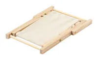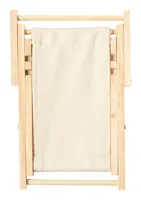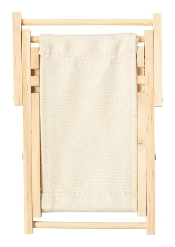 Összecsukható, napozóágy formájú asztali mobiltelefon tartó fából és pamutból.