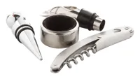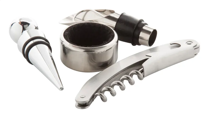 4 részes boros szett, mely dugóhúzót, cseppőrt, dugót és kiöntőt tartalmaz. Fekete díszdobozban szállítjuk.