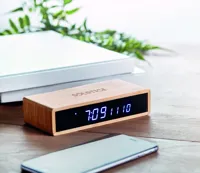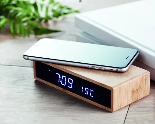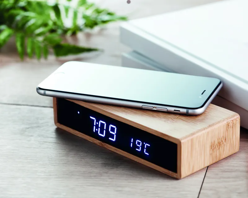 Vezeték nélküli töltő kék LED kijelzővel, ébresztőóra és hőmérő funkcióval, bambusz burkolattal. Villásdugós adapterrel szállítjuk. Vezeték nélküli teljesítmény:DC5V/1A (5W). Az Egyesült Királyság területén való használatra n