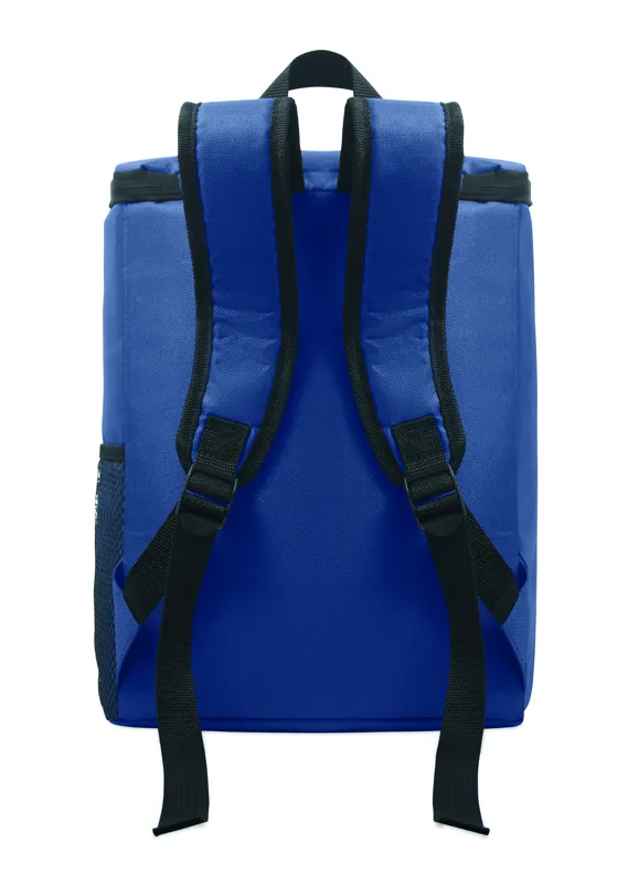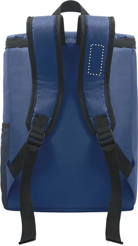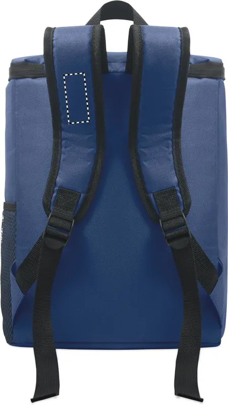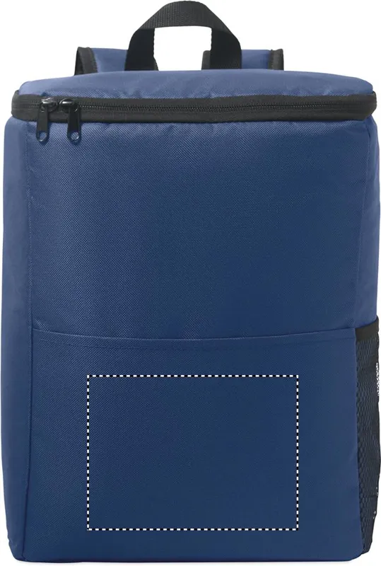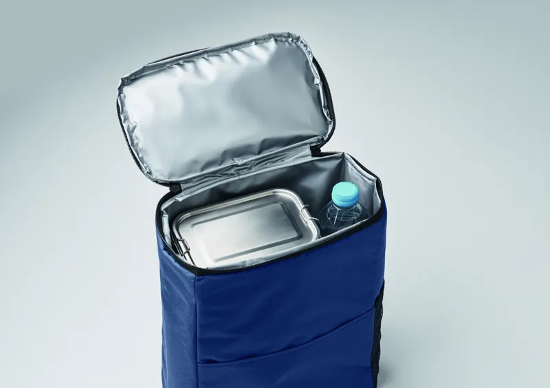 Hűtőtáska hátizsák 600D RPET poliészterből, párnázott, állítható vállpánttal, egy cipzáras oldalsó hálós zsebbel és egy elülső zsebbel. PEVA béléssel és 13 mm PE hab szigeteléssel. Kapacitás: 11 l.