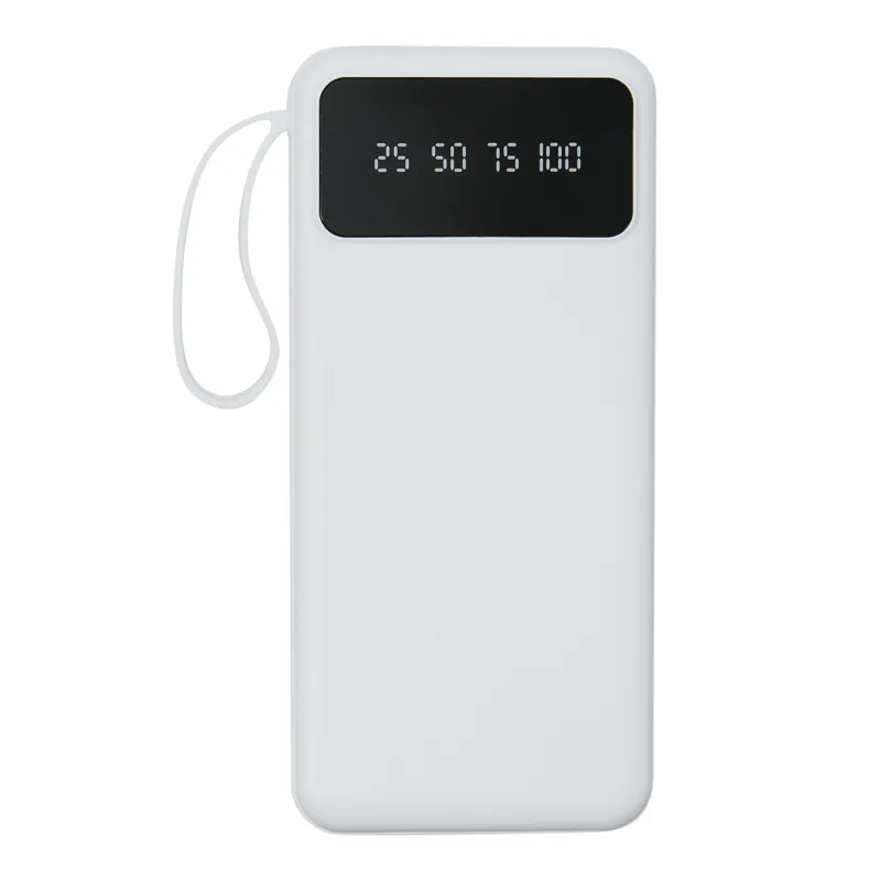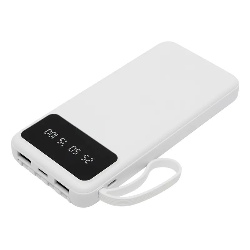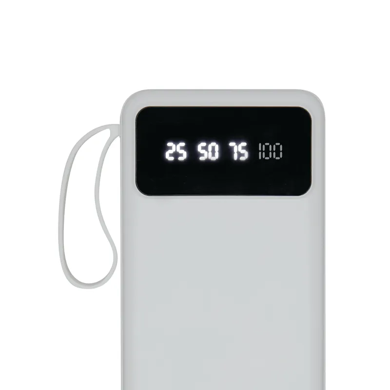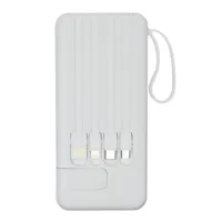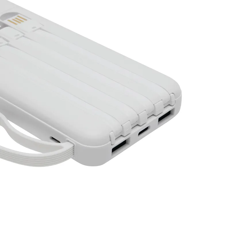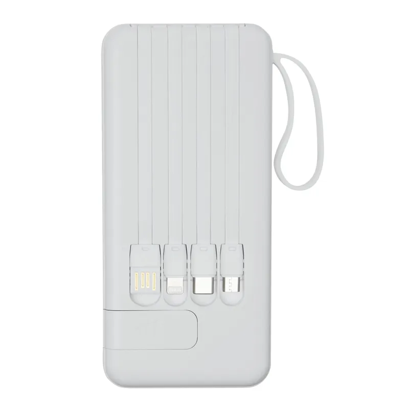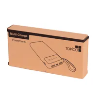 MULTI CHARGE powerbank: alkalmas okostelefonokhoz és USB-csatlakozású eszközökhöz, 1 USB Type-C és 2 Type-A kimenet, kapacitás: 10 000 mAh, 4 integrált töltőkábel a hátoldalon (C típus, Micro -USB, Lightning® és USB Type-A, töltöttségi szint kijelző (25 / 50 / 75 / 100%), erős akkumulátor, bemeneti teljesítmény: 5V/2A, kimeneti teljesítmény: 5V/2A (max.), kihúzható okostelefon tartó, be/ki kapcsolóval