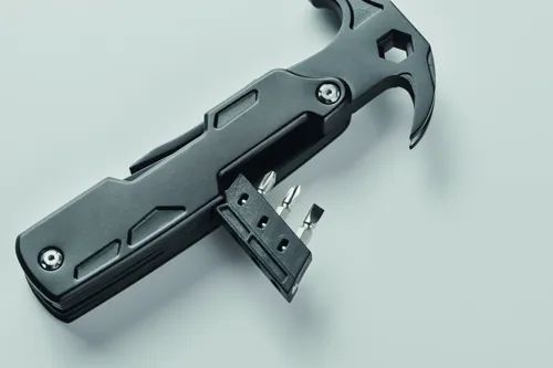 14 az 1-ben rozsdamentes acél multifunkciós kalapács. Tartalmaz szöghúzót, villáskulcsot, fogazott kést, reszelőt, csavarhúzókat, fogót, üvegnyitót, kést és drótvágót.