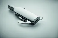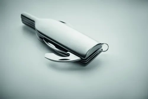Borosüveg alakú, rozsdamentes acél zsebkés 6 funkcióval: üvegnyitó, kés, dugóhúzó, fóliavágó, nagyító és kulcstartó.