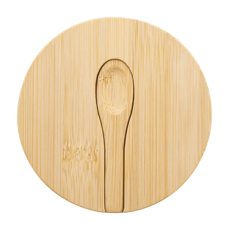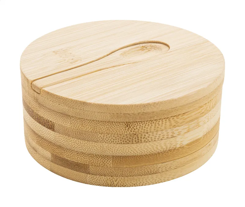Bambuszból készült só- és borstartó doboz két rekesszel és mágneses tekerős tetővel. Beépített tálalókanállal.