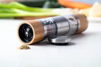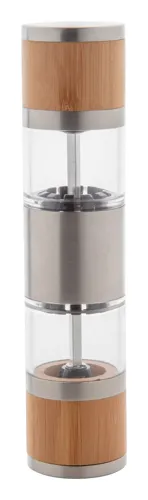 Rozsdamentes acélból készült kézi só- és borsőrlő, bambusz borítással és kerámia őrlőszerkezettel.