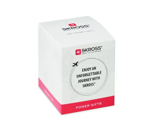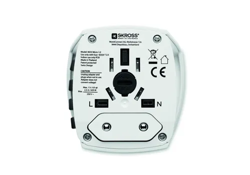 Univerzális SKROSS csatlakozó adapter. Használható: Európa, USA/Japán, Ausztrália/Kína. 2 pólusú, földeletlen. Megfelel minden nemzetközi biztonsági vonatkozású szabványnak és normának. Gyerekbiztos.