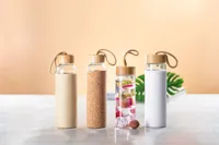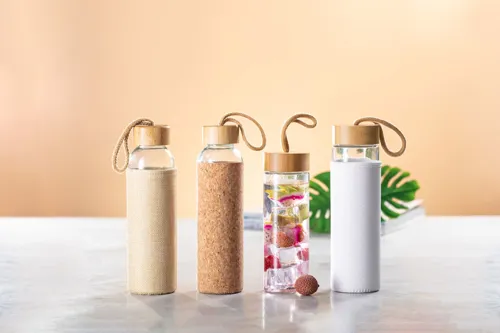 Üveg kulacs természetes parafa borítással, bambusz kupakkal és hordszíjjal, 500 ml. Nem alkalmas szénsavas italok tárolására.