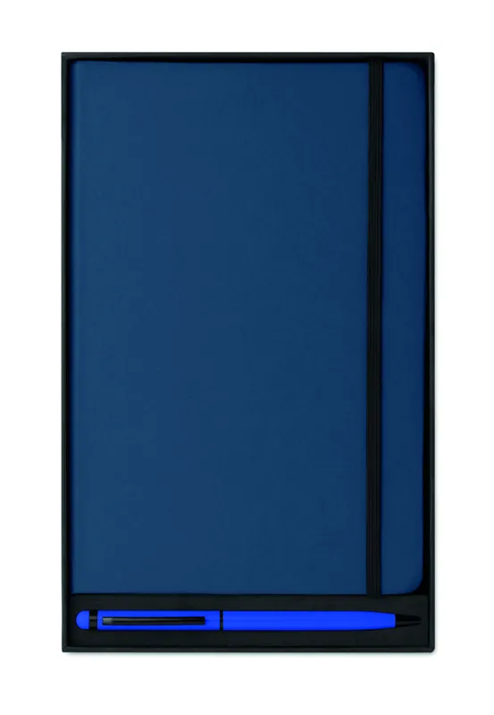 A5 jegyzetfüzet érintőhegyes golyóstollal, keménytáblás borítóval. Cérnafűzött. 144 vonalas oldal (72 lap). Fekete elasztikus zárópánt és könyvjelző szalag. Színben illeszkedő érintőhegyes golyóstoll, kéken író betéttel. FSC MIX CREDIT | P7.1 | FSC-C213206