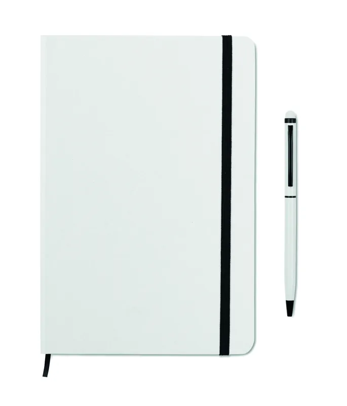 A5 jegyzetfüzet érintőhegyes golyóstollal, keménytáblás borítóval. Cérnafűzött. 144 vonalas oldal (72 lap). Fekete elasztikus zárópánt és könyvjelző szalag. Színben illeszkedő érintőhegyes golyóstoll, kéken író betéttel. FSC MIX CREDIT | P7.1 | FSC-C213206