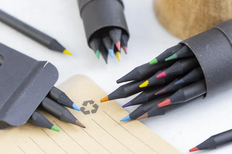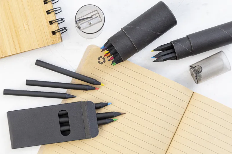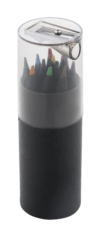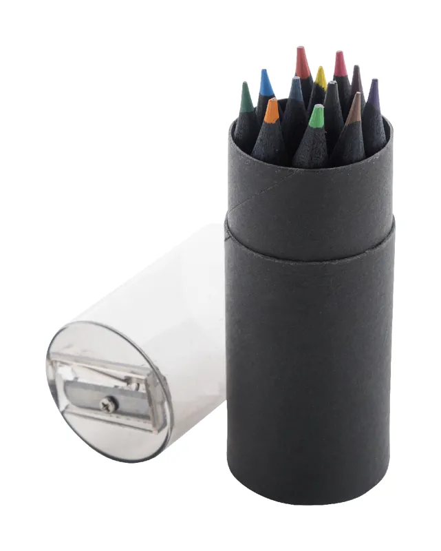 12 db-os fekete fa színű ceruzakészlet kerek fekete karton tokban, műanyag hegyezővel.