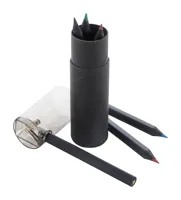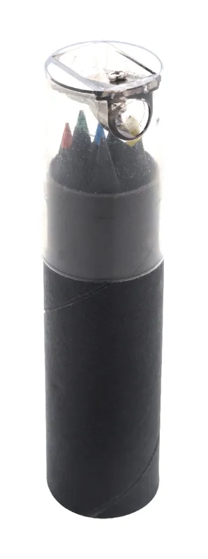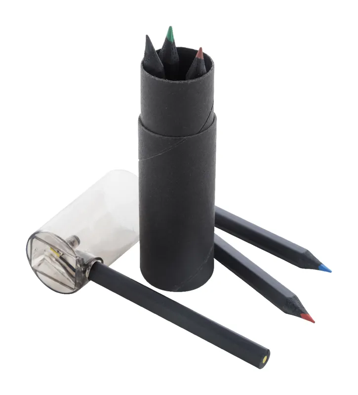 6 db-os fekete fa színű ceruza szett kerek fekete karton tokban, műanyag hegyezővel.