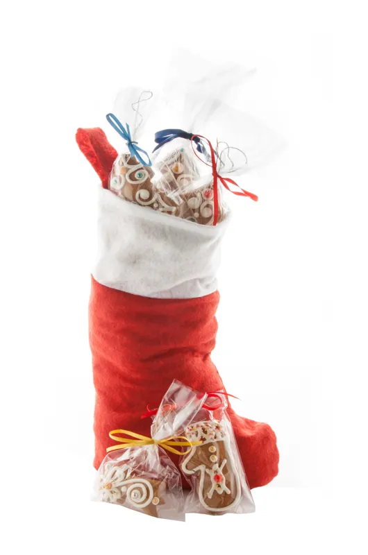 Poliészter anyagból készült, csizma alakú karácsonyi ajándéktasak.