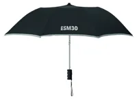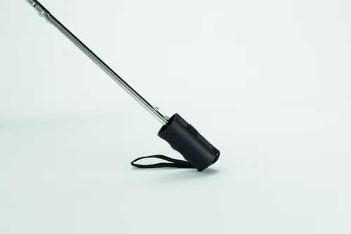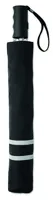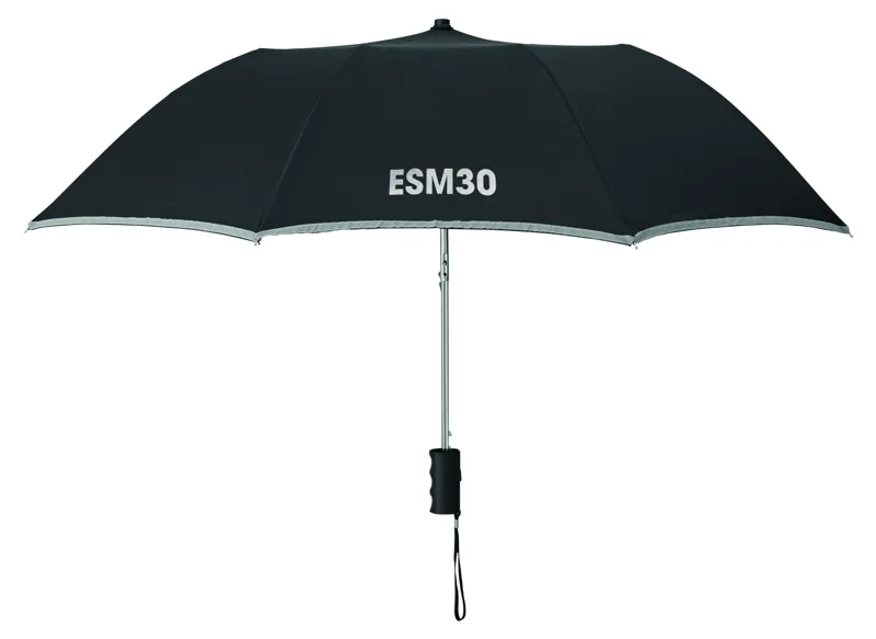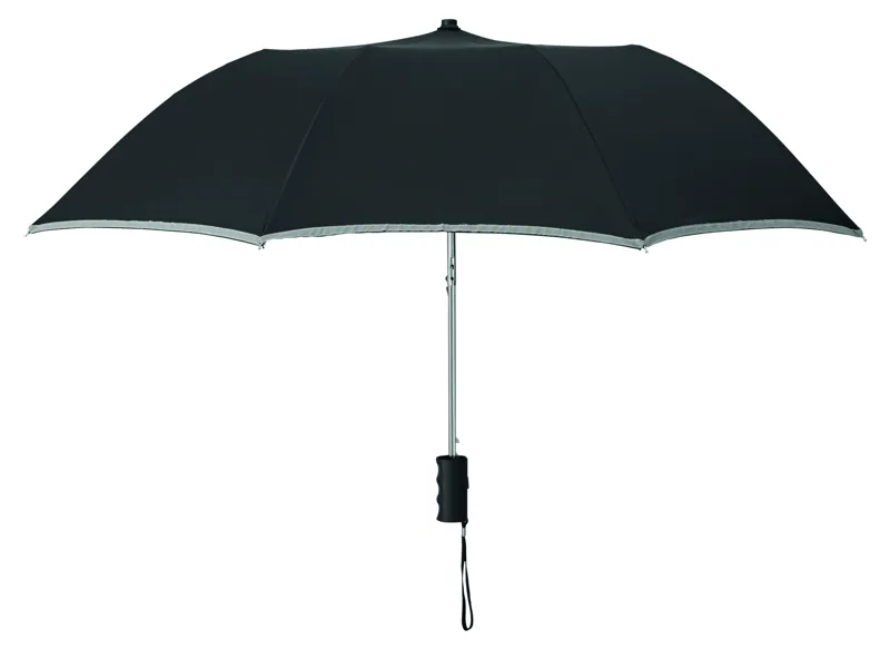 21 colos, 2 szakaszos összecsukható, automata esernyő 190T nyersselyem anyagból. Galvanizált acél nyél, váz és csúcsok. Fényvisszaverő díszítés a paneleken. Fekete műanyag markolat csuklópánttal. Hozzáillő tokban. Manuális záródás.