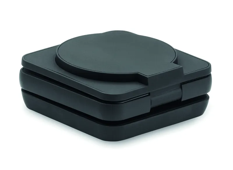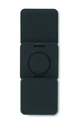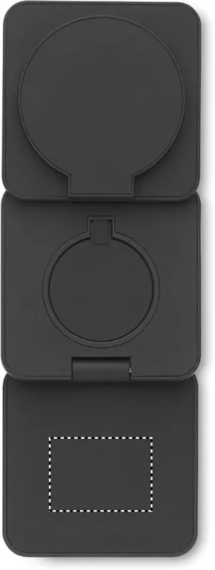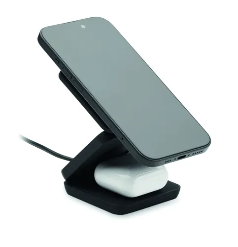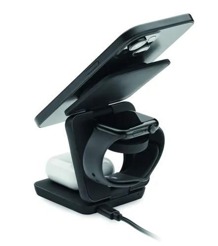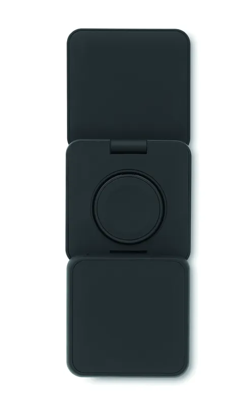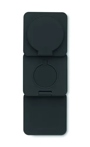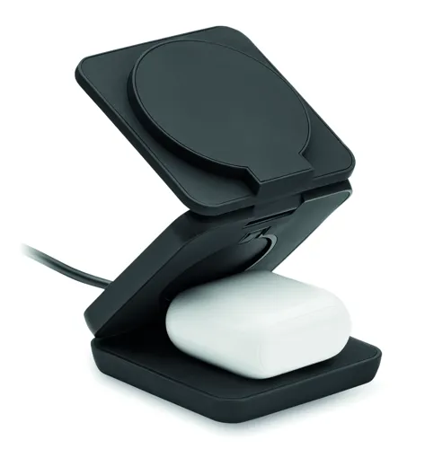 3 az 1-ben összecsukható töltőállomás gumírozott, újrahasznosított ABS-ből. 15 W-os mágneses vezeték nélküli töltőt, okosóra-töltőt (csak Apple®) és TWS töltőt tartalmaz.