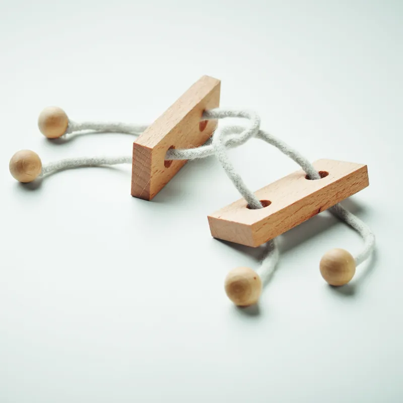 Bükkfából készült, téglalap alakú fejtörő ördöglakat. Újrahasznosított papírdobozban. A fa természetes anyag, termékenként szín- és méretbeli eltérések jelentkezhetnek, ami befolyásolhatja a dekoráció végső eredményét.