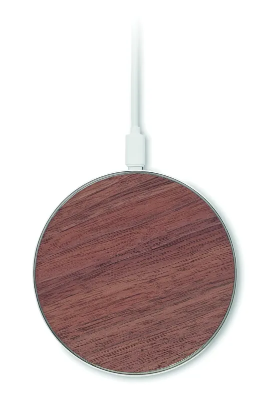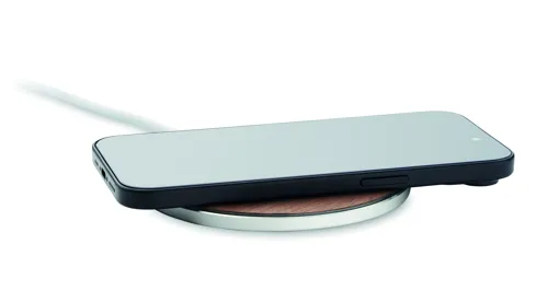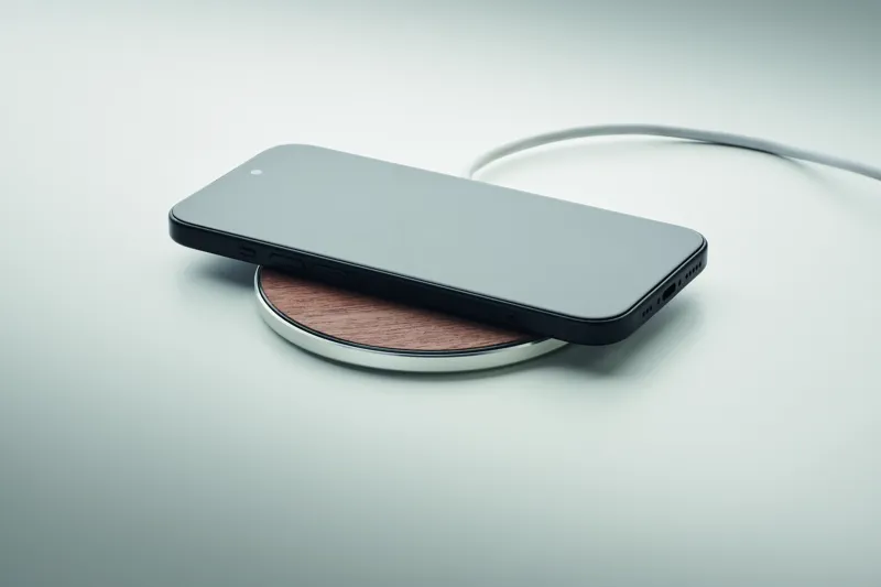 Vezeték nélküli töltő újrahasznosított alumíniumból, diófa részlettel a tetején. Csatlakoztassa a számítógéphez és helyezze rá az okostelefont. DC 9V/1.67A (15W) teljesítmény.
