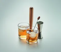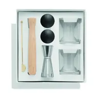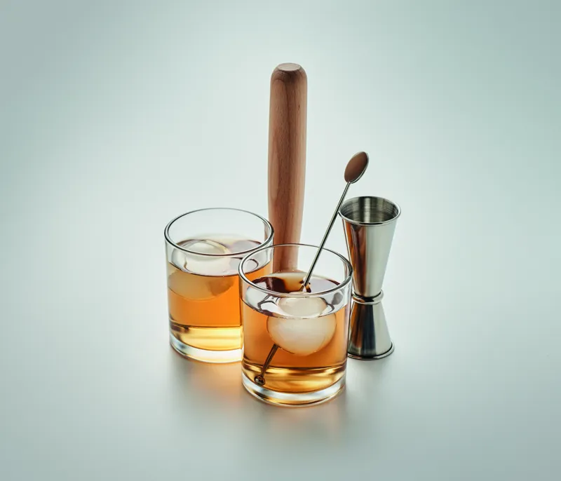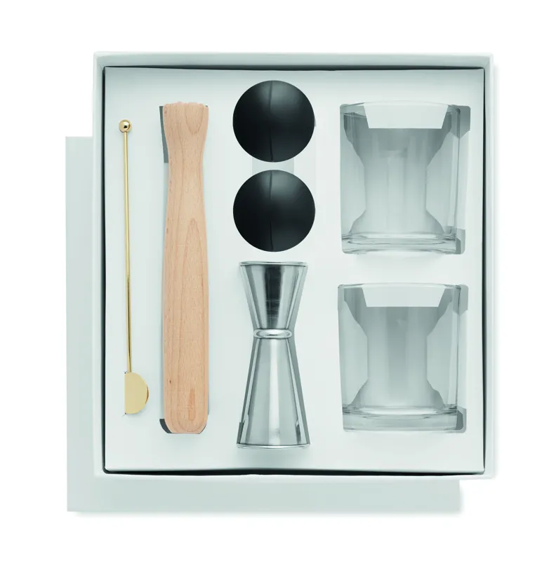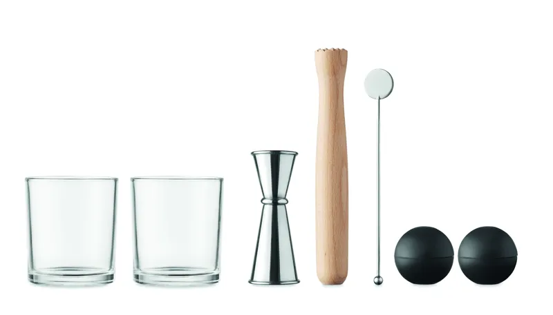Koktélpohár készlet. A szett 7 elemet tartalmaz: két poharat, egy kétoldalas rozsdamentes acél mérőedényt (25 és 50 ml), egy törőfát, egy rozsdamentes koktélkeverő pálcát és két szilikon jéggömb készítő formát.