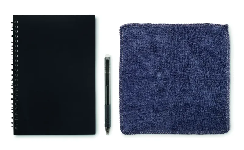 A5-es újrafelhasználható jegyzetfüzet PP borítóval. 36 vonalas papírlap (18 lap) minerális papír. Kompatibilis bármely dokumentum-beolvasó alkalmazással. Vízzel eltávolítható toll és tisztító kendő tartozék.
