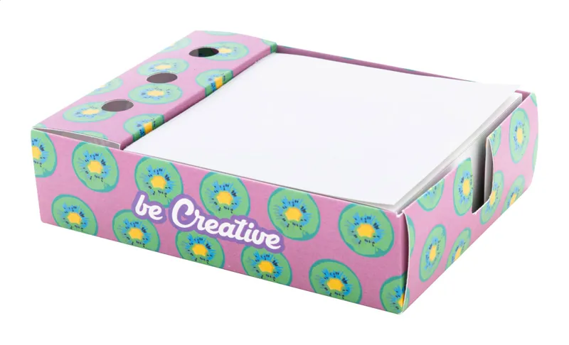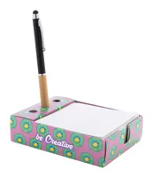Egyedi, papír tolltartó és jegyzetadagoló 300 lapos jegyzettömbbel újrahasznosított papírból (90×90 mm). Az ár tartalmazza a színes nyomtatást a tartóra. Minimális rendelési mennyiség: 100 db.
