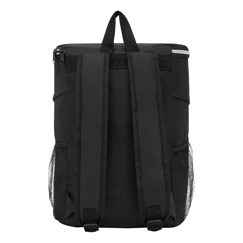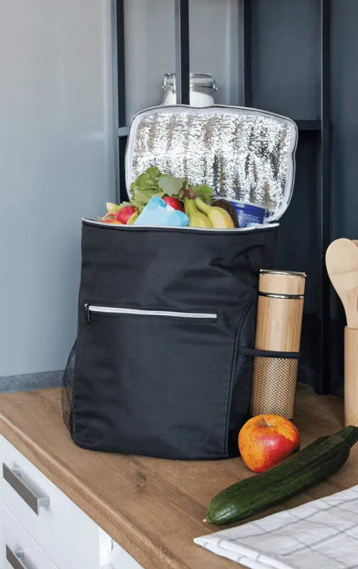 NOME hűtőtáska hátizsák: 1 nagy, szigetelt fő rekesz cipzárral, 1 cipzáras elülső zseb, 2 hálós oldalzseb, párnázott vállpántok, hordozó fogantyúk