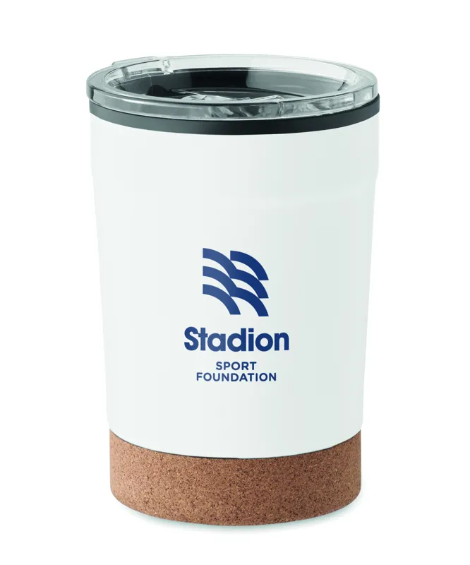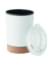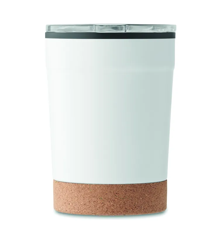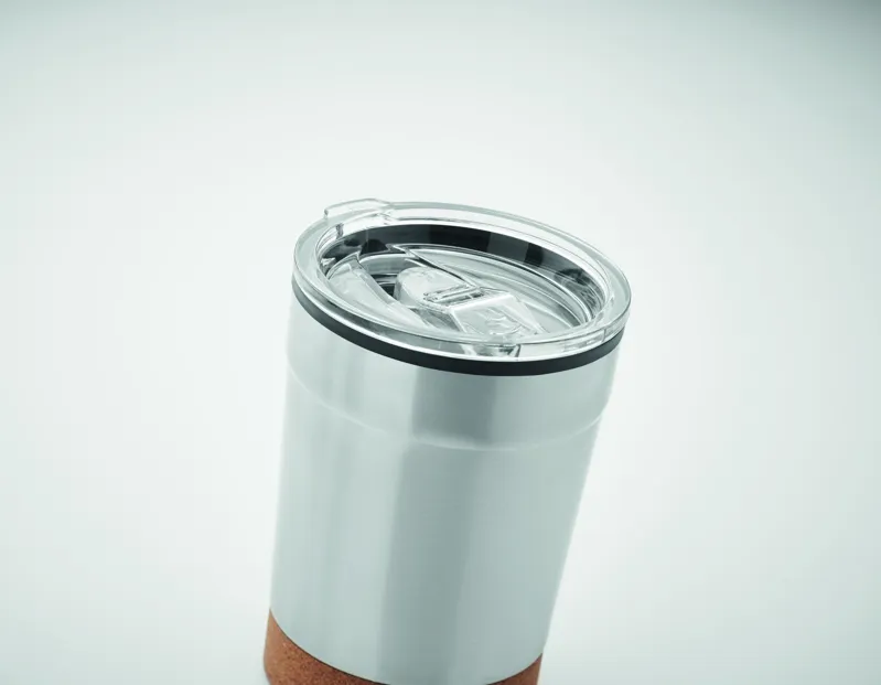 Duplafalú rozsdamentes acél pohár PP belső oldallal, parafa talppal és csúsztatható ivónyílással ellátott fedéllel. Szivárgásmentes. Űrtartalom: 300 ml.