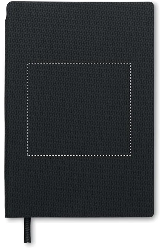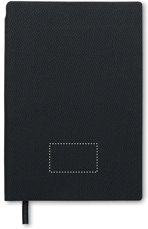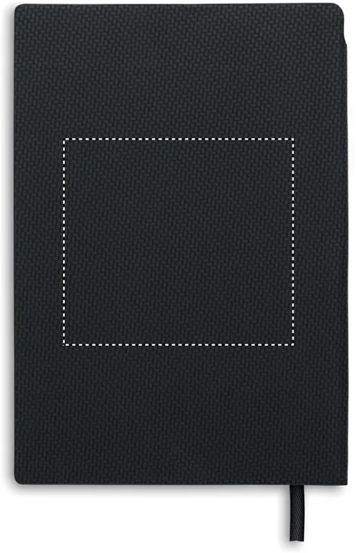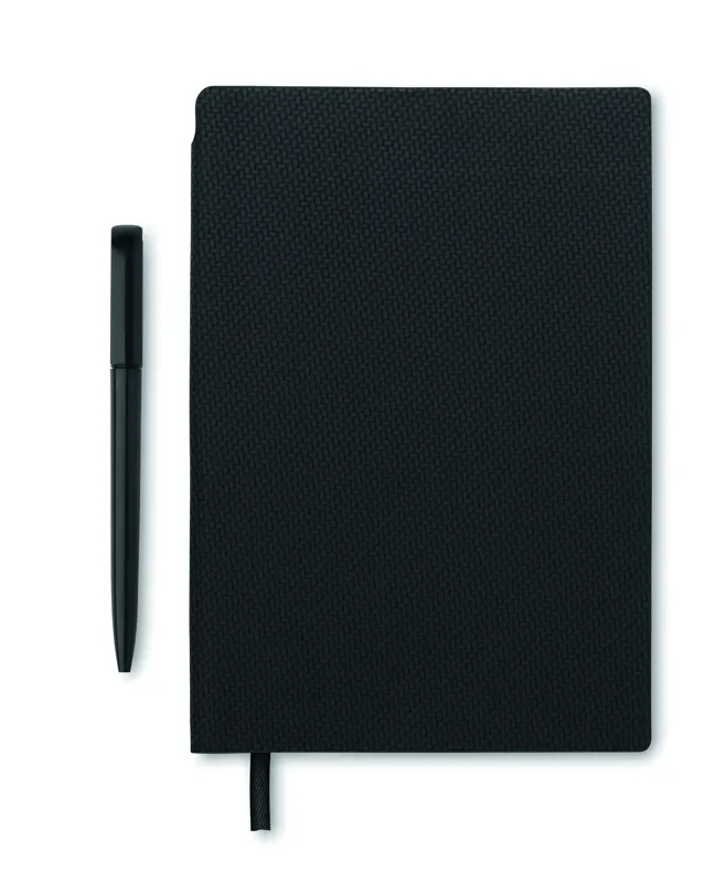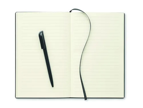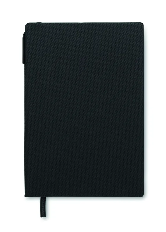 A5 jegyzetfüzet strukturált felületű PU borítóval, a gerincénél kialakított tolltartóban ABS csavarzáras golyóstollal. Cérnafűzött. 160 vonalas oldal (80 lap) újrahasznosított papírból.