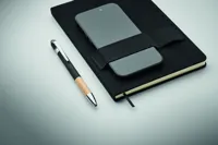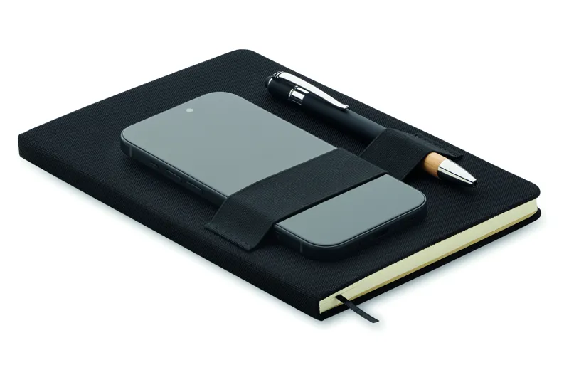 A5 jegyzetfüzet 600D RPET keménytáblás borítóval. Az elülső borítón elasztikus telefontartó pánttal és tolltartó hurokkal, bambusz markulatú, alumínium nyomógombos golyóstollal. Cérnafűzött. 160 vonalas, újrahasznosított papír oldal (80 lap). A hátsó borító belső oldalán irattartó zseb. Elasztikus zárópánt. Könyvjelző szalag. Kéken író betéttel. FSC®-certified | FSC MIX CREDIT, P7.1 , FSC-C213206