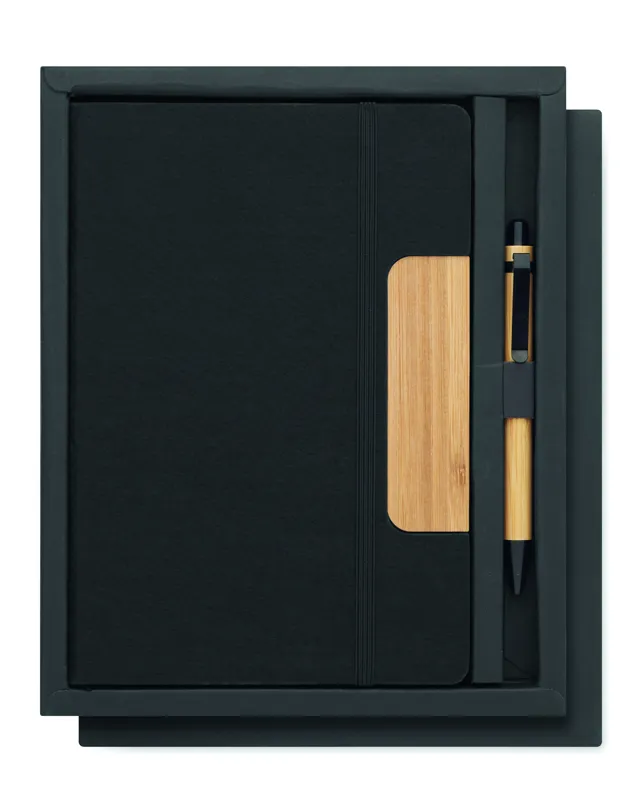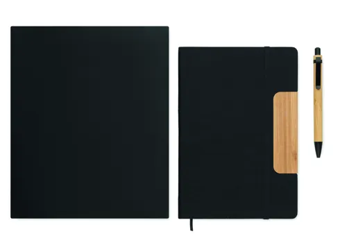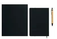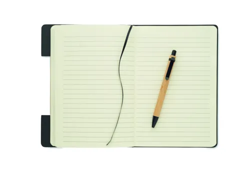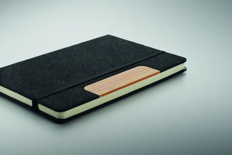 A5 keménytáblás, RPET filc borítós, telefonállvány funkciós jegyzetfüzetből és bambusz tolltestű, nyomógombos golyóstollból álló készlet. Cérnafűzött. 160 vonalas oldal (80 lap) újrahasznosított papírból. Elasztikus zárópánt, könyvjelző szalag. Kéken író betéttel.