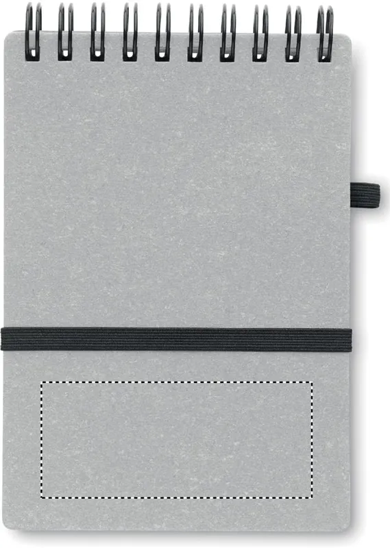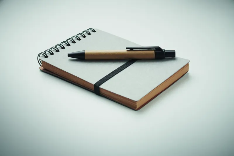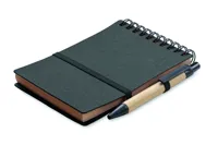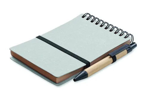 B7 újrahasznosított papír és PU borítós (70% újrahasznosított papír és 30% PU) jegyzetfüzet. Spirálozott. 140 vonalas, újrahasznosított papír oldal (70 lap). Színben illeszkedő nyomógombos golyóstoll, újrahasznosított papír tolltesttel, ABS szerelvényekkel. Kéken író betéttel. Elasztikus zárópánt és tolltartó hurok. FSC®-certified | FSC MIX CREDIT, P7.1, FSC-C213206