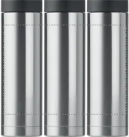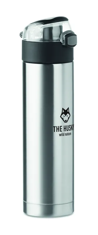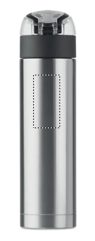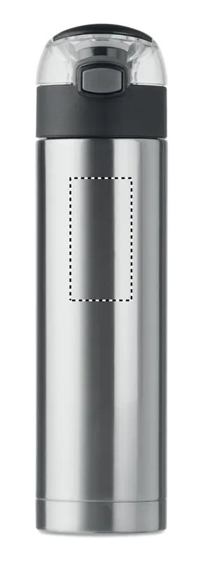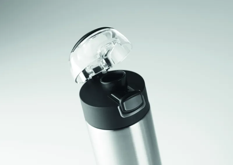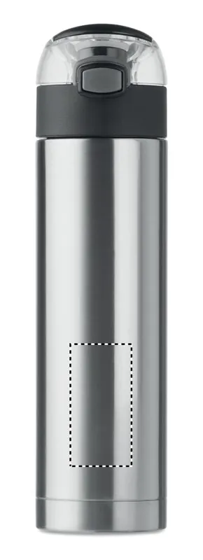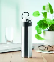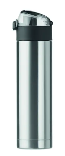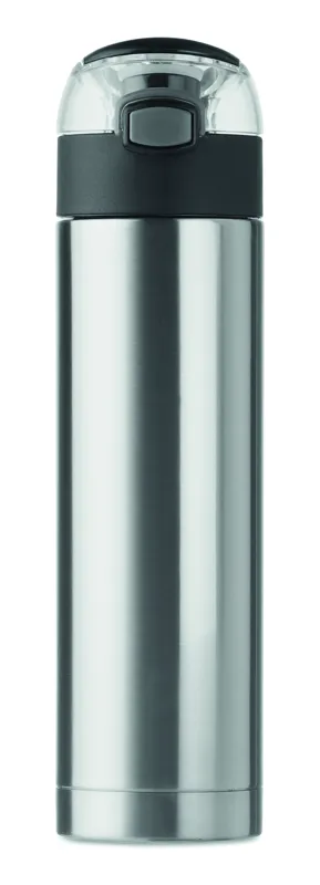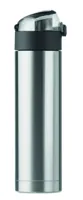 Rozsdamentes acélból készült, duplafalú palack a kupakon biztonsági zárral. Nyomógombbal nyitható. A tetején lévő lehajtható fogantyúval könnyen szállítható. 400 ml űrtartalom. Szivárgásmentes.