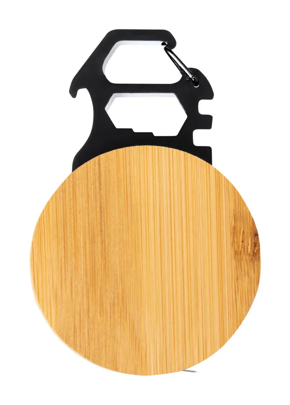 Bambusz és fekete rozsdamentes acél multiszerszám 1 m-es mérőszalaggal, üvegnyitóval, 5 hatlapfejű kulccsal és karabinerrel.