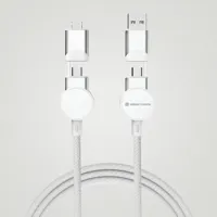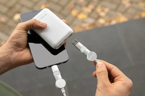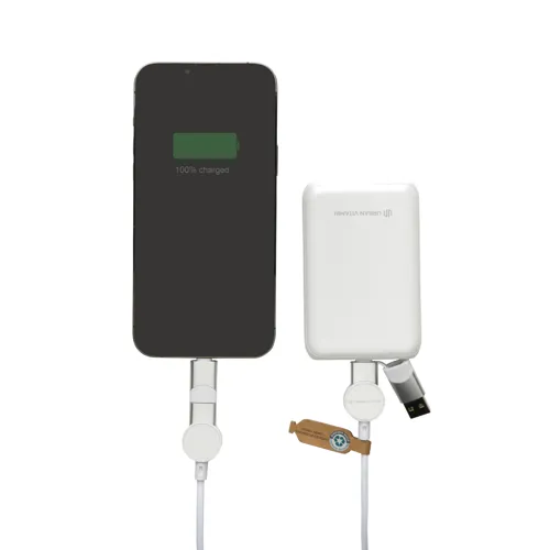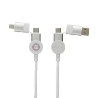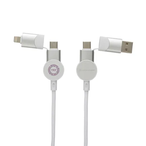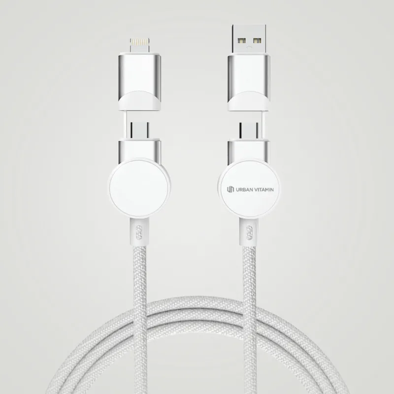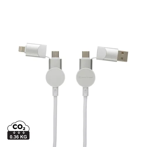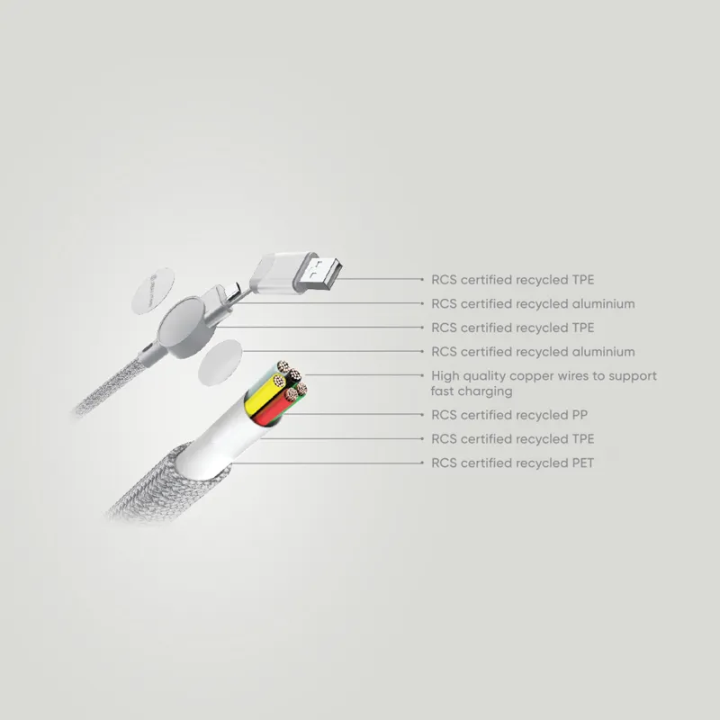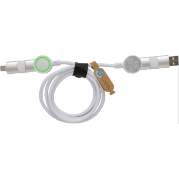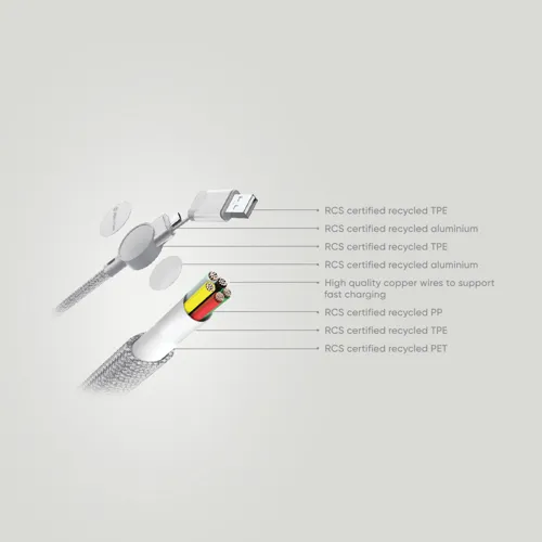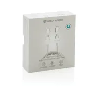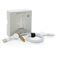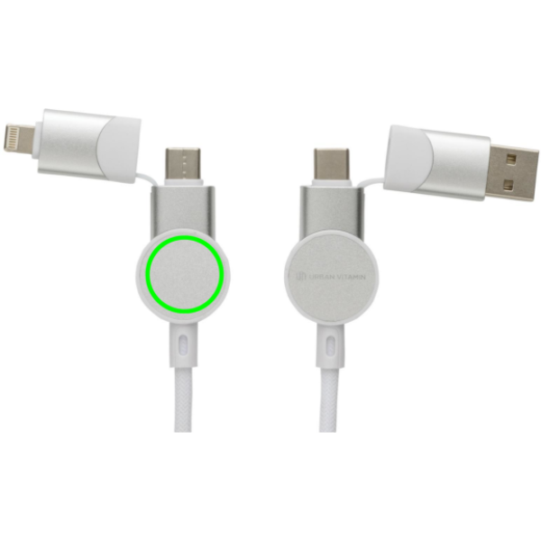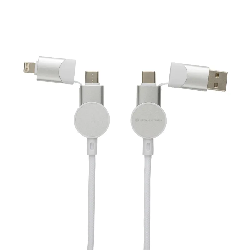 Tanúsítottan újrahasznosított anyagokból készült, gyorstöltésre alkalmas kábel. A ház 100% RCS újrahasznosított TPE műanyag/RCS újrahasznosított alumínium, a kábel RCS újrahasznosított TPE belsővel valamint újrahasznosított PET külsővel rendelkezik. Az RCS (Recycled Claim Standard) egy szabvány mely tanúsítja a termék újrahasznosított anyag tartalmát a teljes ellátási lánc során. A kábel 120 cm hosszú, 5 csatlakozóval: C típusú bemenet, C típusú kimenet, USB A bemenet, IOS kimenet, micro USB kimenet. A termék a legújabb készülékekkel is használható, melyek C típusú kimenettel rendelkeznek. Az USB A ki- és bemenet segítségével bármilyen kimenetű eszköz használható a kábellel. A C típusú lightening max áramerőssége 18W. C típusról C típusra max áramerőssége 45W. Az Urban Vitamin termékek PVC mentesek valamint műanyagcsökkentett csomagolásban érkeznek. Teljes újrahasznosított anyag tartalom 52% a termék összsúlya alapján. Töltésre és adatátvitelre is alkalmas.