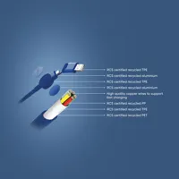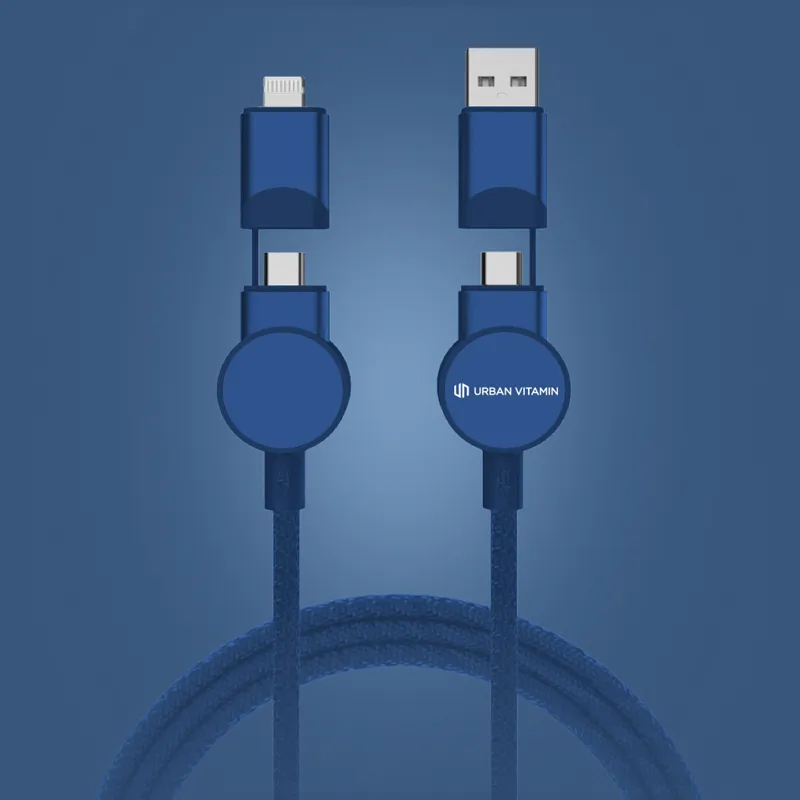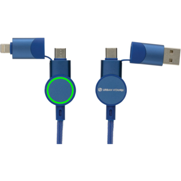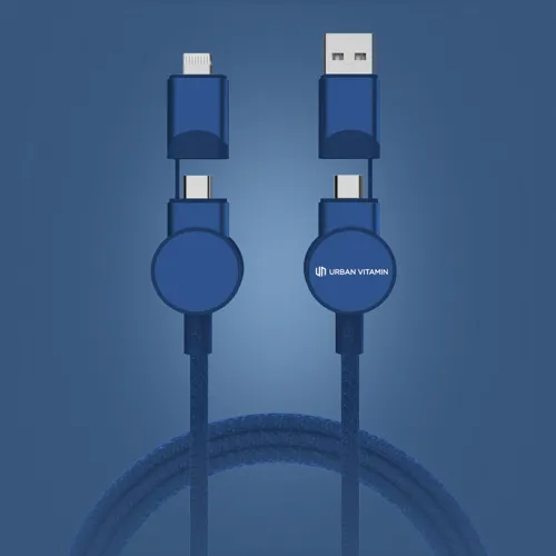 Tanúsítottan újrahasznosított anyagokból készült, gyorstöltésre alkalmas kábel. A ház 100% RCS újrahasznosított TPE műanyag/RCS újrahasznosított alumínium, a kábel RCS újrahasznosított TPE belsővel valamint újrahasznosított PET külsővel rendelkezik. Az RCS (Recycled Claim Standard) egy szabvány mely tanúsítja a termék újrahasznosított anyag tartalmát a teljes ellátási lánc során. A kábel 120 cm hosszú, 5 csatlakozóval: C típusú bemenet, C típusú kimenet, USB A bemenet, IOS kimenet, micro USB kimenet. A termék a legújabb készülékekkel is használható, melyek C típusú kimenettel rendelkeznek. Az USB A ki- és bemenet segítségével bármilyen kimenetű eszköz használható a kábellel. A C típusú lightening max áramerőssége 18W. C típusról C típusra max áramerőssége 45W. Az Urban Vitamin termékek PVC mentesek valamint műanyagcsökkentett csomagolásban érkeznek. Teljes újrahasznosított anyag tartalom 52% a termék összsúlya alapján. Töltésre és adatátvitelre is alkalmas.