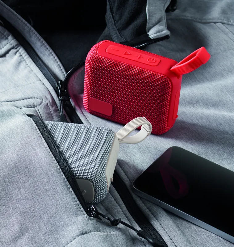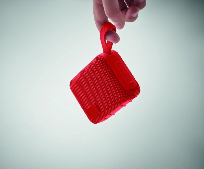5.0 vezeték nélküli hangszóró ABS-ből, RPET hangfalselyemmel, akasztózsinórral. 1 újratölthető 800 mAh lítium-ion akkumulátorral. SD-kártya porttal és AUX/USB kábellel. Teljesítmény: 5W, 3 Ohm és 5V. Üzemidő kb. 3 óra.