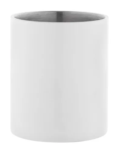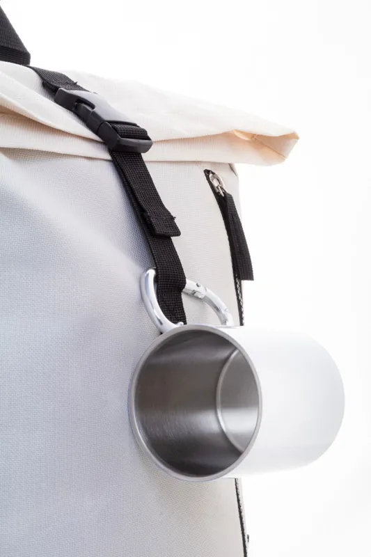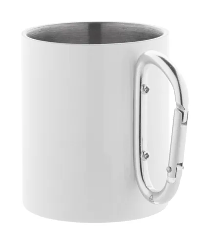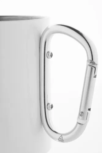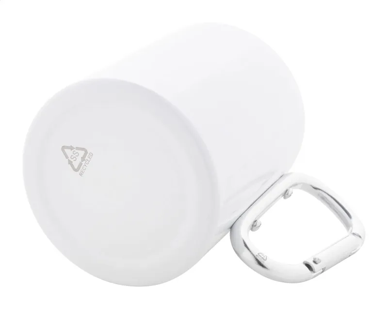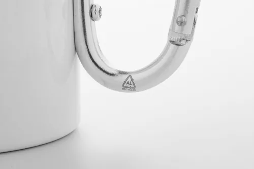 Duplafalú, újrahasznosított rozsdamentes acél szublimációs termo bögre újrahasznosított alumínium karabineres fogantyúval. 300 ml. Kraft papír dobozban.