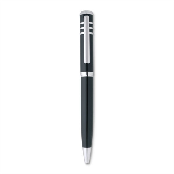 Fényes, lakkozott kivitelű fém golyóstoll karton díszdobozban. Feketén író betéttel.