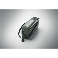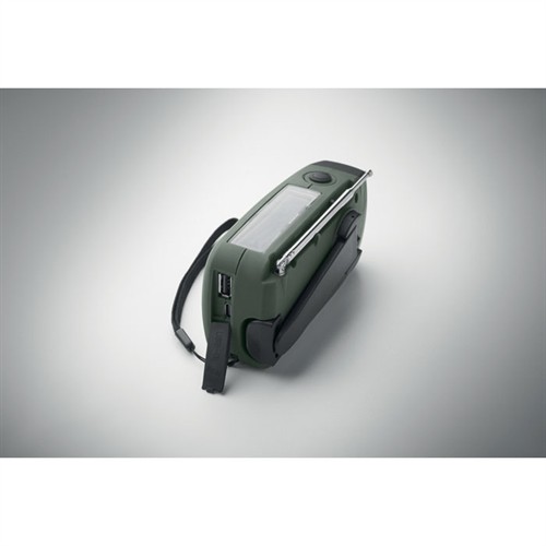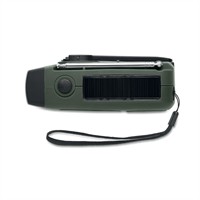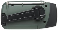 Hordozható AM/FM rádió ABS-ből, LED zseblámpával (2 állítási lehetőség) és 1200 mAh külső akkumulátor powerbankkal vésztöltéshez. Napenergiával és kézi hajtókarral egyaránt működtethető.