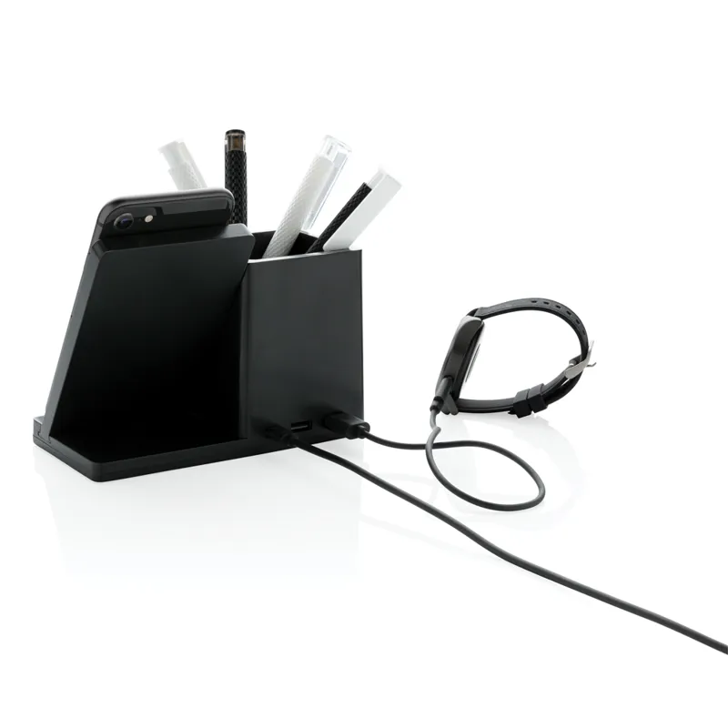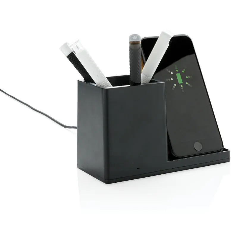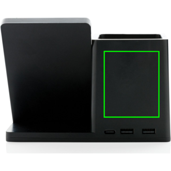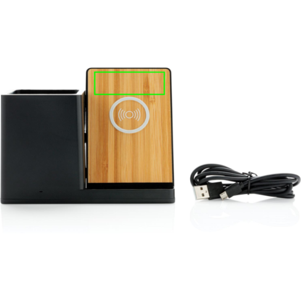 RCS (Recycled Claim Standard) újrahasznosított ABS-ből készült 10W-os vezeték nélküli gyorstöltő tolltartóval. Teljes újrahasznosított anyag tartalom: 78% a termék összsúlya alapján. Az RCS-tanúsítvány biztosítja az újrahasznosított anyagok ellátási láncát. Bambusz vezeték nélküli töltési felület FSC 100 bambuszból. Két USB csatlakozóval a hátoldalán a kábelen keresztüli töltéshez. A vezeték nélküli töltés az Android legújabb generációival, iPhone 8 és újabb verziókkal kompatibilis. A termék és tartozékai PVC-mentesek. RCS újrahasznosított TPE-ből készült 120 cm-es C típusú töltőkábellel. FSC mix kraftdobozban. C típusú bemenet; Bemenet 5V/2A; 9V/2A; Vezeték nélküli kimenet 5V/1A; 9V/1,1A; (10 W) Bejegyzett dizájn®