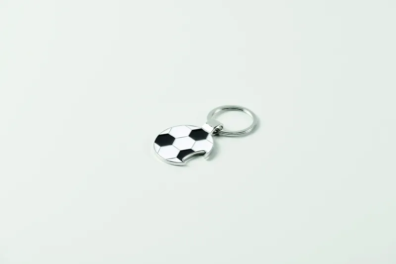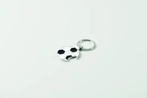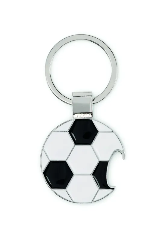 Focilabda alakú, üvegnyitós kulcstartó cink ötvözetből, vas kulcskarikával.