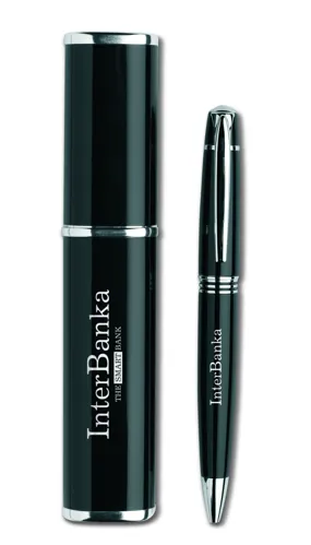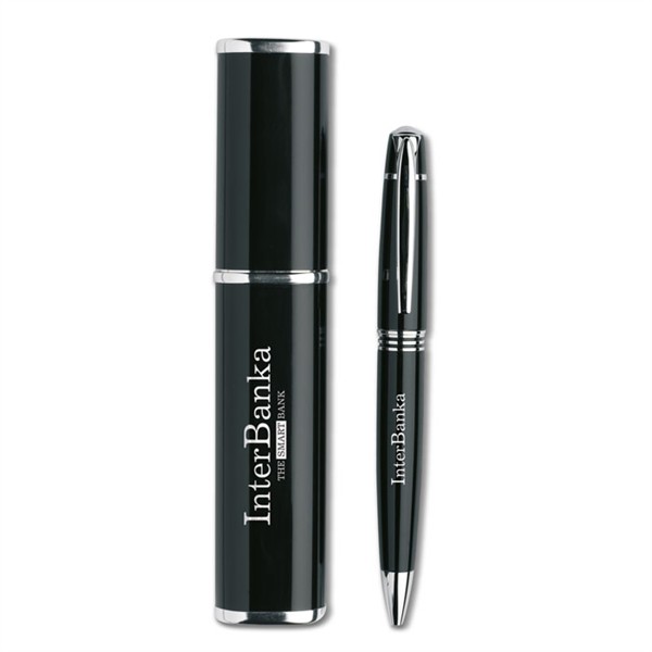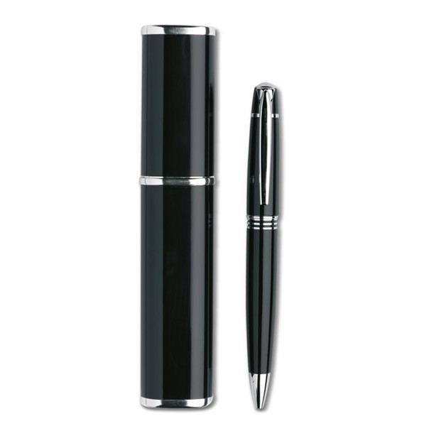 Csavarmechanikás fém golyóstoll alumínium ajándékdobozban. Feketén író fém tollbetéttel.