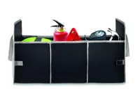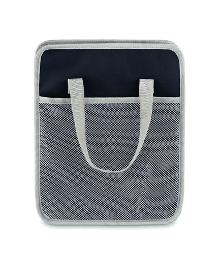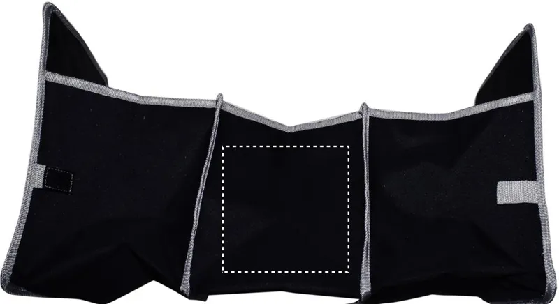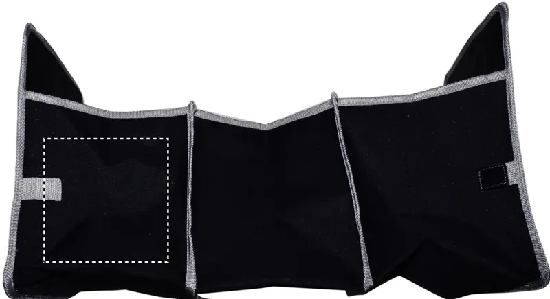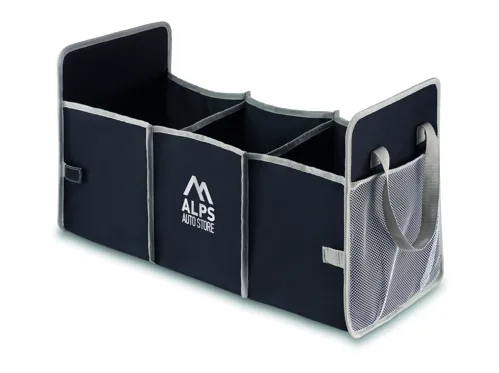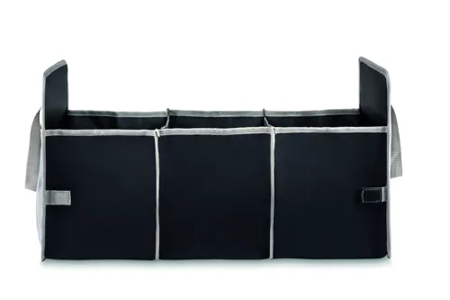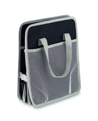 Összecsukható autós rendező 600D poliészter anyagból. Hálós zsebbel az oldalán.