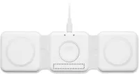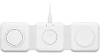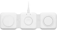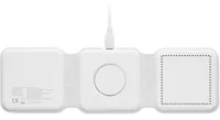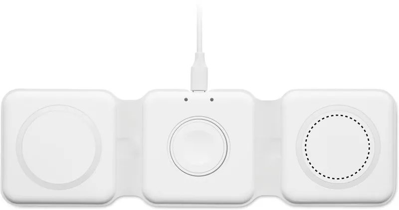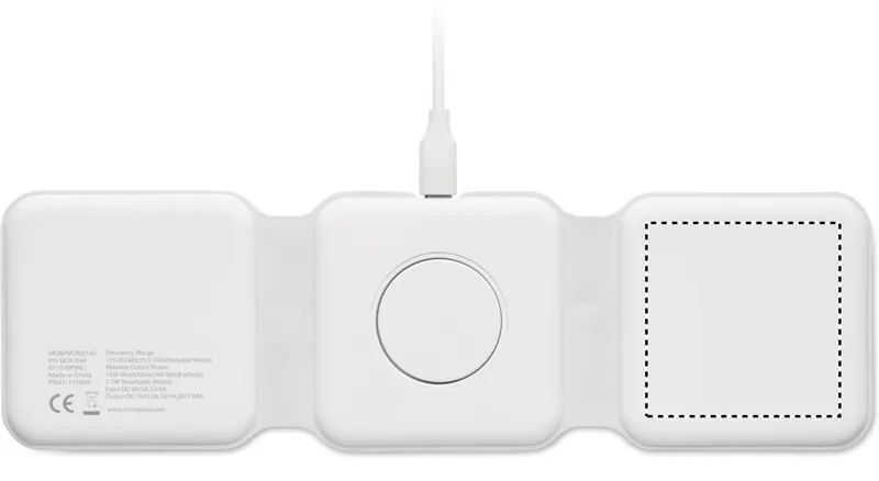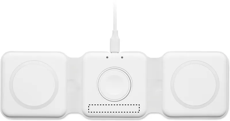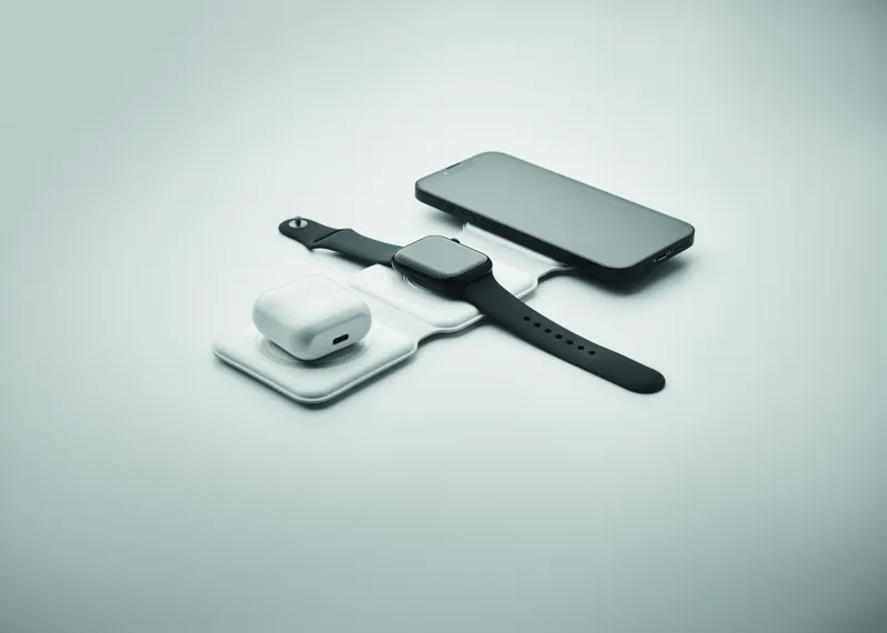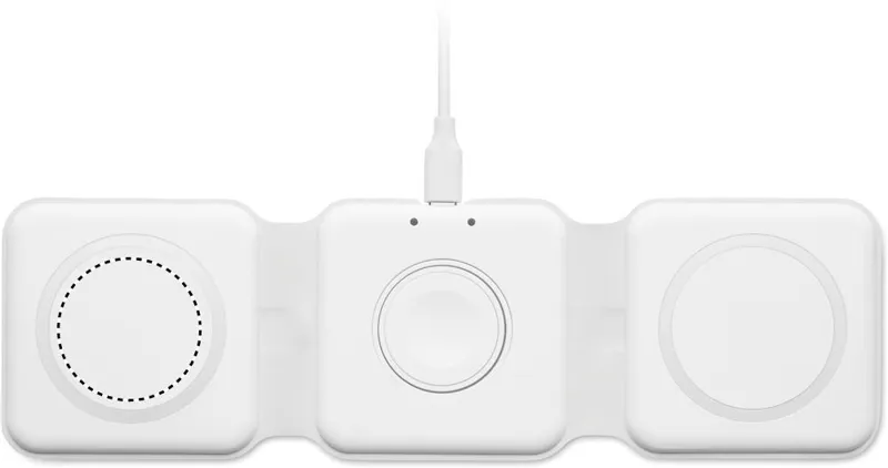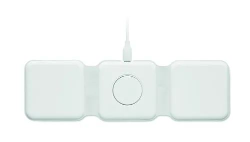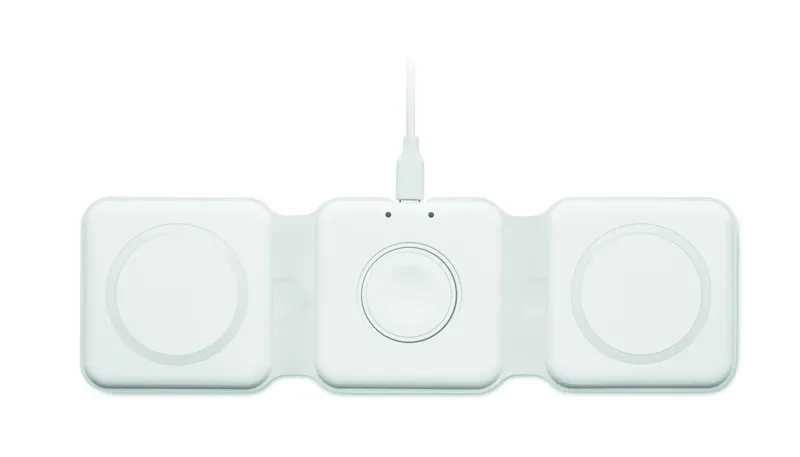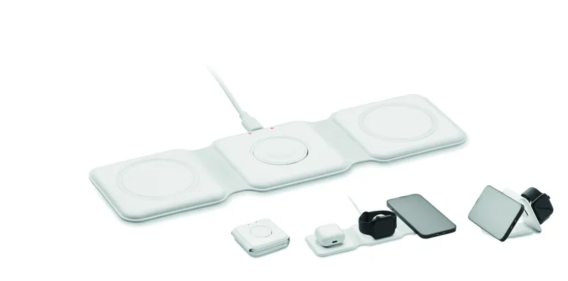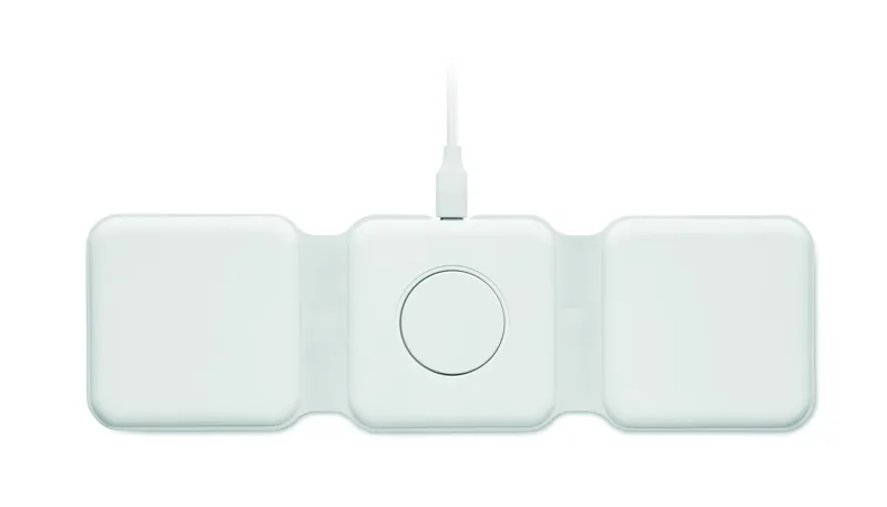3 az 1-ben összecsukható töltőállomás ABS-ből. 3 vezeték nélküli töltési ponttal rendelkezik. Bemenet: 2 az 1-ben C-típusú és USB-A. Összteljesítmény: 15W.