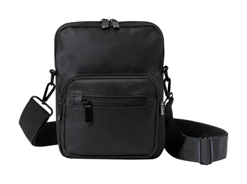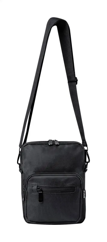 RPET válltáska cipzáras rekeszekkel és állítható vállpánttal. 600D RPET poliészter, megkülönböztető RPET címkével.