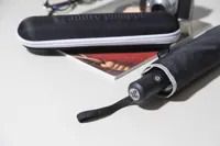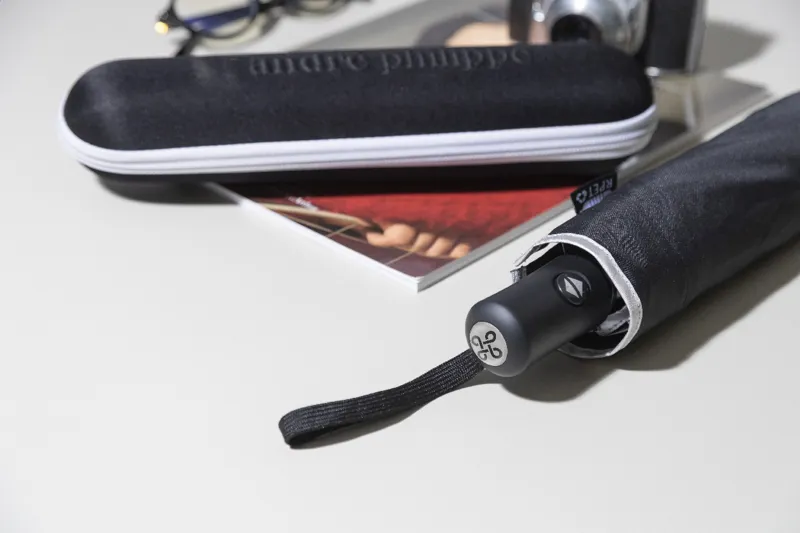 Teljesen automata (nyitás/zárás), szélálló, összecsukható esernyő 8 panellel, ezüst díszítéssel. Fém vázzal, üvegszálas bordákkal, gumírozott fogantyúval, csuklópánttal és hordtáskával. 190T RPET pongee. Megkülönböztető RPET címkével. Márkás, cipzáras, kemény tokban. André Philippe márkatermék.