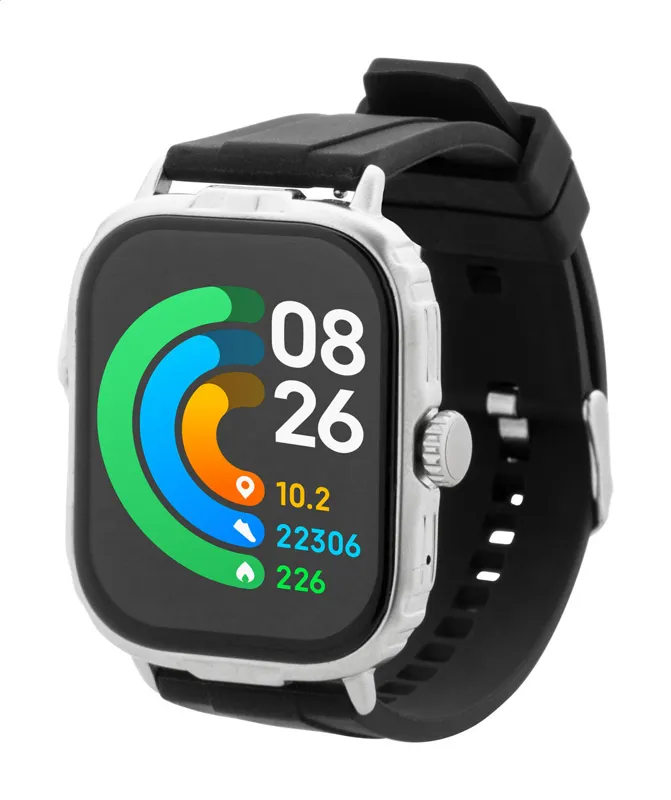 Többfunkciós vezeték nélküli okosóra fém házban 2,01"-es TFT érintőképernyővel, 210 mAh-s újratölthető akkumulátorral és szilikon szíjjal. Számos egészségfigyelő és intelligens funkcióval rendelkezik, mint például pulzusszám, vérnyomás és oxigén monitor. Csatlakoztatható okostelefonokhoz ingyenes alkalmazással iOS és Android számára. Mágneses USB töltőkábellel, IP65 vízállóságú.