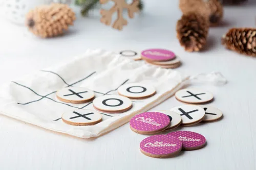 Egyedi gyártású, rétegelt nyírfából készült amőba stratégiai játék 10 db koronggal, pamut tasakban. Az ár tartalmazza a korongok hátoldalának azonos grafikával történő full colour emblémázásának költségét. Minimális rendelési mennyiség: 100 db.