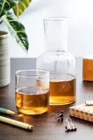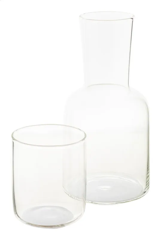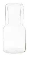 Boroszilikát üveg vizes kancsó (800 ml) és ivópohár (300 ml) készlet. Kraft papír dobozban. Hideg és meleg italokhoz egyaránt alkalmas, dekantáló üvegként is használható.